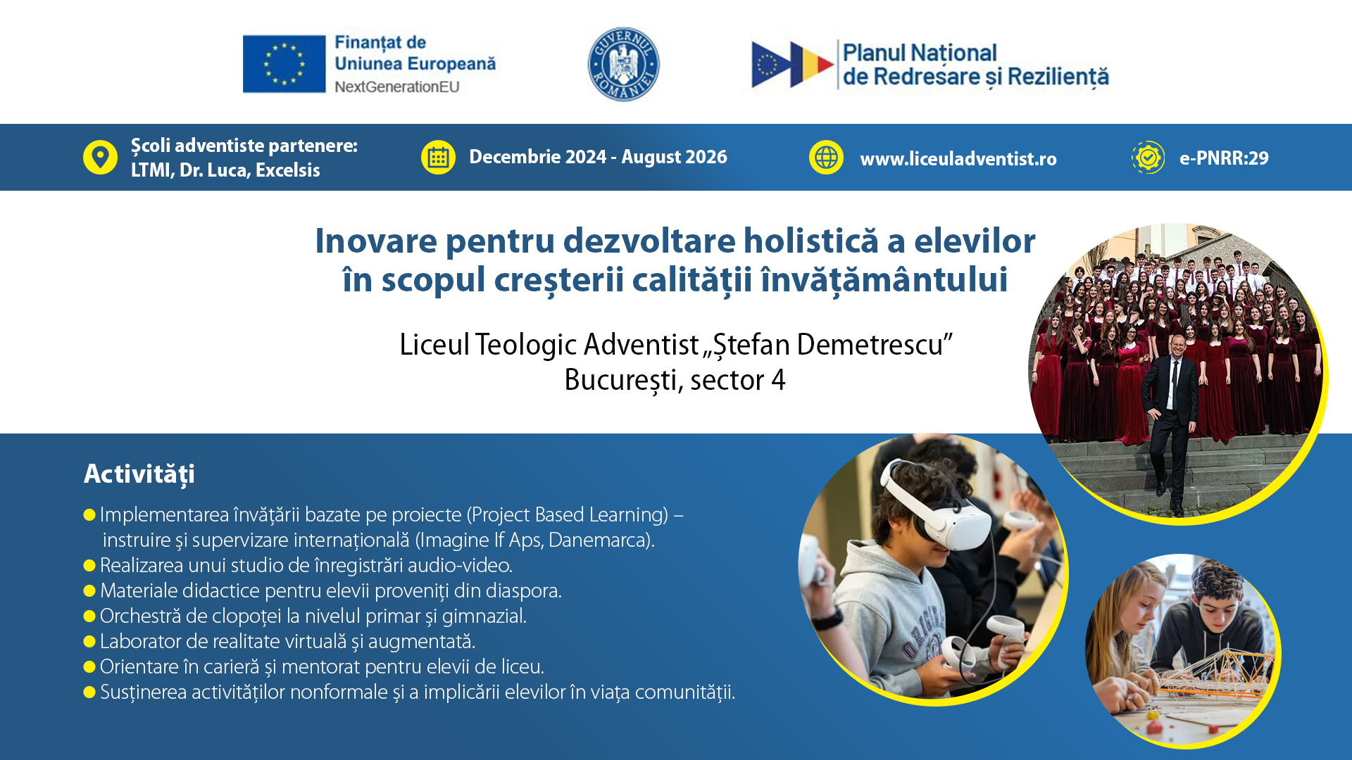 Liceul Teologic Adventist „Ștefan Demetrescu”, inclus în proiectul „Granturi pentru unitățile de învățământ pilot – Inovare pentru dezvoltare holistică a elevilor în scopul creșterii calității învățământului”, finanțat prin Planul Național de Redresare și Reziliență (PNRR), a demarat programul de formare și implementare a învățării bazate pe proiecte (Project-Based Learning). Astfel, în data de 26 august 2025, a avut loc prima etapă a instruirii, realizată de către IMAGINE IF ApS – Danemarca, etapă ce a vizat personalul de conducere al școlii și la care a participat un grup de 9 cadre didactice. În luna noiembrie, este planificată următoarea etapă, aceea de...